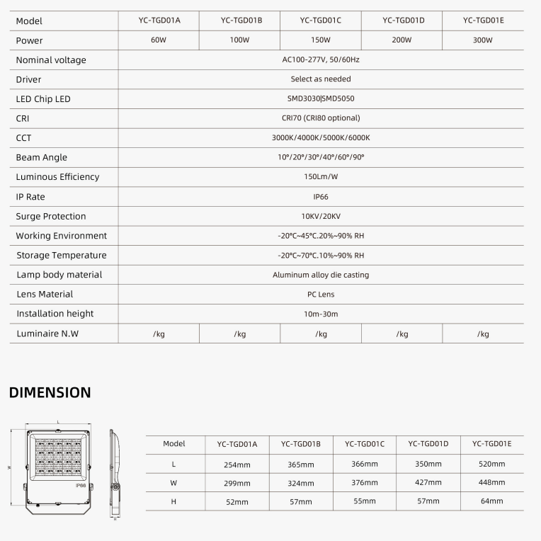 | YC-TGD01-50W | 358*294*52 | 50w | Siltuma izlietne Alumīnija korpuss, stikls, kronšteins, 304 skrūves, PCB, objektīvs. |